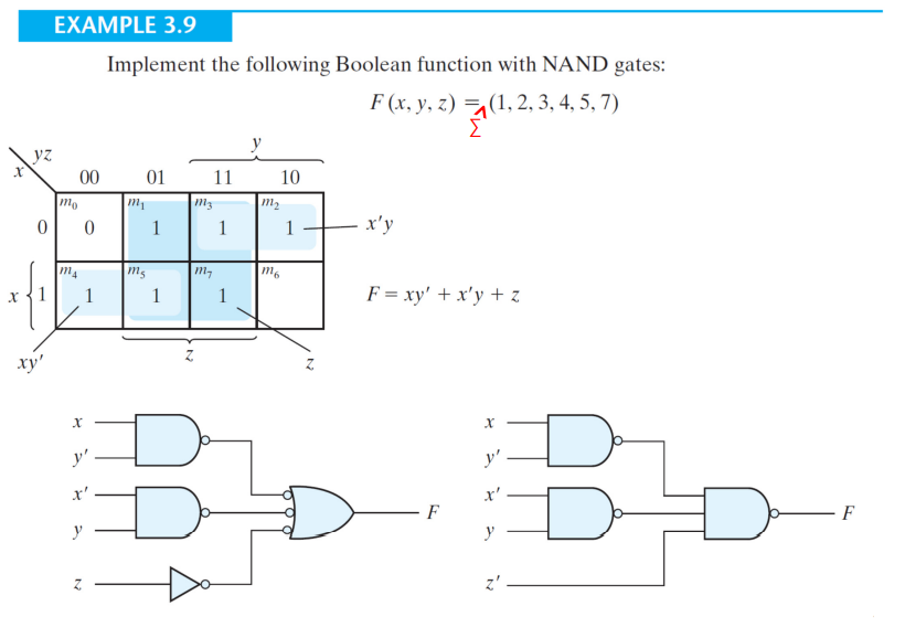 이렇게 범용적인 만능 NAND 게이트로 2-레벨 부울 함수를 구현하기 위해서는 먼저 부울 함수를 곱의 합(sum of products) 형식으로 표현해야 한다.