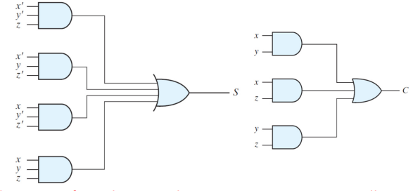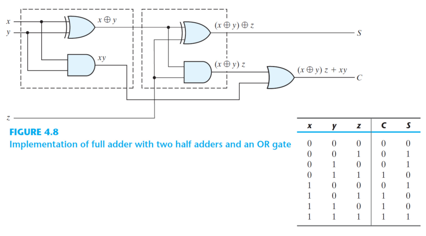 위와 같이 전가산기의 논리회로 구성은 반가산기 두 개의 연산으로 처리될 수 있다. (더 범용적 표현)