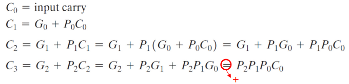이후 각 단계의 캐리 출력에 대한 부울 함수를 쓸 수 있고. 각 Ci의 아랫단의 식을 대입해주면 된다.