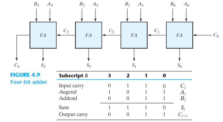 처음 가산기의 입력 캐리 C0는 0으로 설정되고, C1,2,3,4는 전가산기를 통과하며 캐리를 생성하고 넘겨준다.