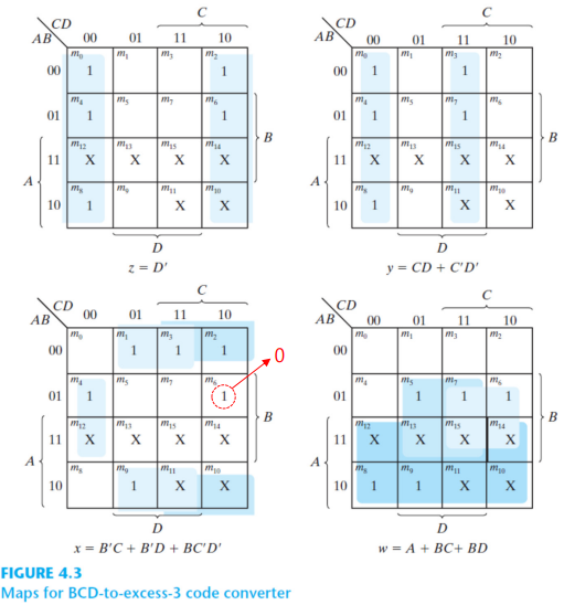 다음으로는 각 출력 변수마다 (z y x w) k-map 을 이용하여 간략화된 부울 함수를 구한다. (don't care은 위치고정)