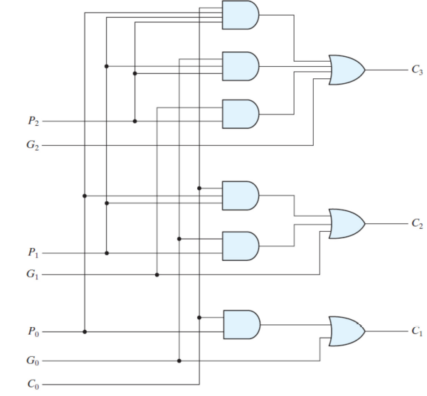 이러한 과정을 가진 논리 회로도를 캐리 룩어헤드 생성기라고 하고 다음과 같이 구성된다.