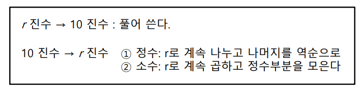 두번째 과정에서 10진수를 우리가 원하는 r'진수로 바꿀 때 정수부를 구하는 방법과 소수부를 구하는 방법이 다르다.