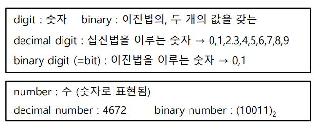 즉 이러한 용어를 이용하여 학습 목표를 말해보자면, "우리가 일상에서 사용하는 수(number)인 decimal number 을 binary number로 변환해야 컴퓨터가 알아먹는다."