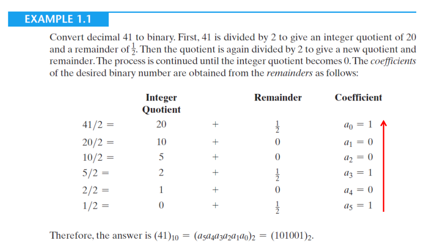 먼저 정수부이다. example 1.1에서는 decimal number인 41을 binary number로 바꾸는 과정이 담겨있다.