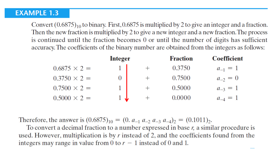 example 1.3과 같이. 0.6875를 바꾸자 할 때. 2진수로 바꾸어야 하니 2로 계속해서 곱해주면 정수부와 소수부로 나누어져서 나오게 된다.