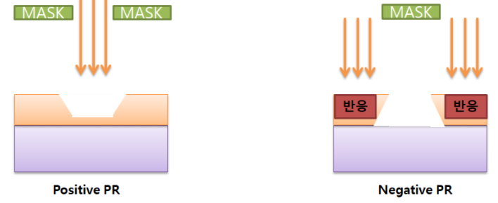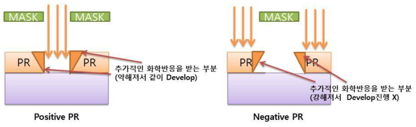 이렇게 두가지 종류의 PR은 빛을 받는 노광의 단계부터 바로 차이를 보이게 된다.