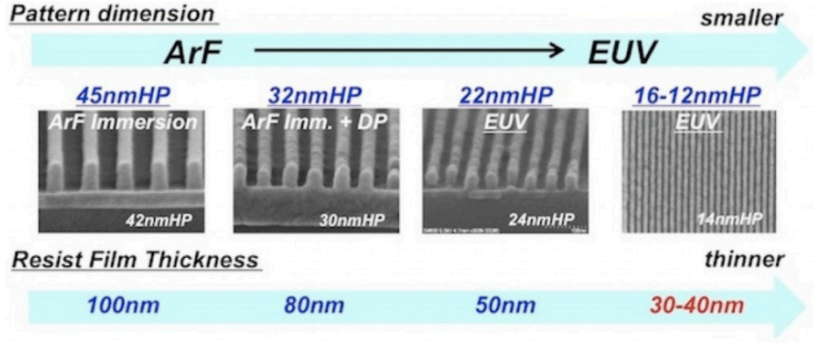 노광시 사용하는 빛의 파장은 KrF - ArF - EUV 의 단파장으로 변화해 가면서 흡수율이 높은 파장을 사용하기 때문에