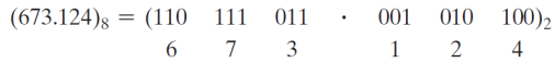 예를들어 (673.124)8 이라는 octa number를 binary number로 바꾸는 경우를 생각해보자.