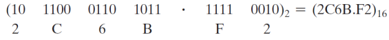 자 이젠 (10110001101011.11110010)2라는 2진수를 16진수로 바꿔보자. 8진수 때와는 다르게 16진수는 2진수에서 4개의 digits으로 표현되기 때문에 이번엔 4자리씩 수를 찢어준다.