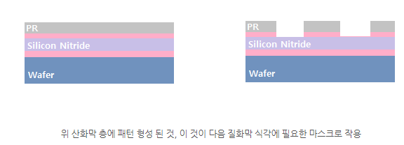 감광제 패턴은 산화막 위에 증착되고 다음에 질화막 식각을 위한 마스크로 사용된다 (그림)