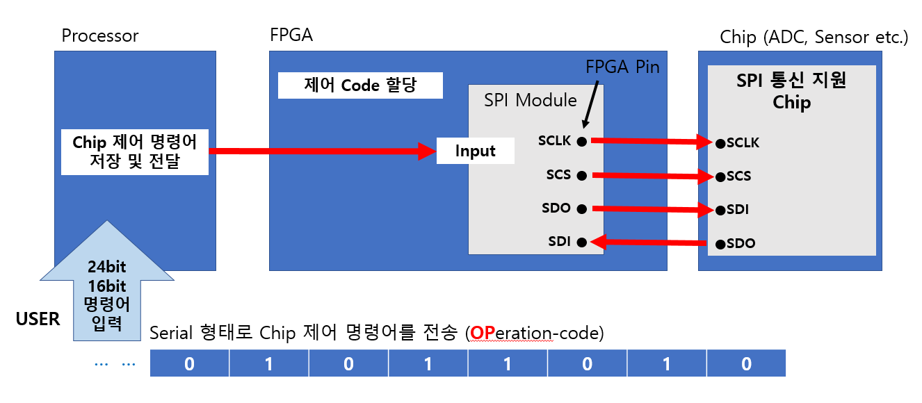 - FPGA는 프로세서로부터 받은 제어 명령어를 FPFA 내부에 있는 SPI module (Verilog 형태)에 전달.