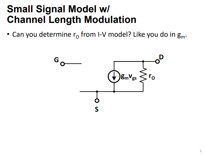 - λ의 CLM의 term은 Vds에 대한 수식이므로, Small Signal Model에서 Vds에 대한 current path가 생긴다는 것이다.